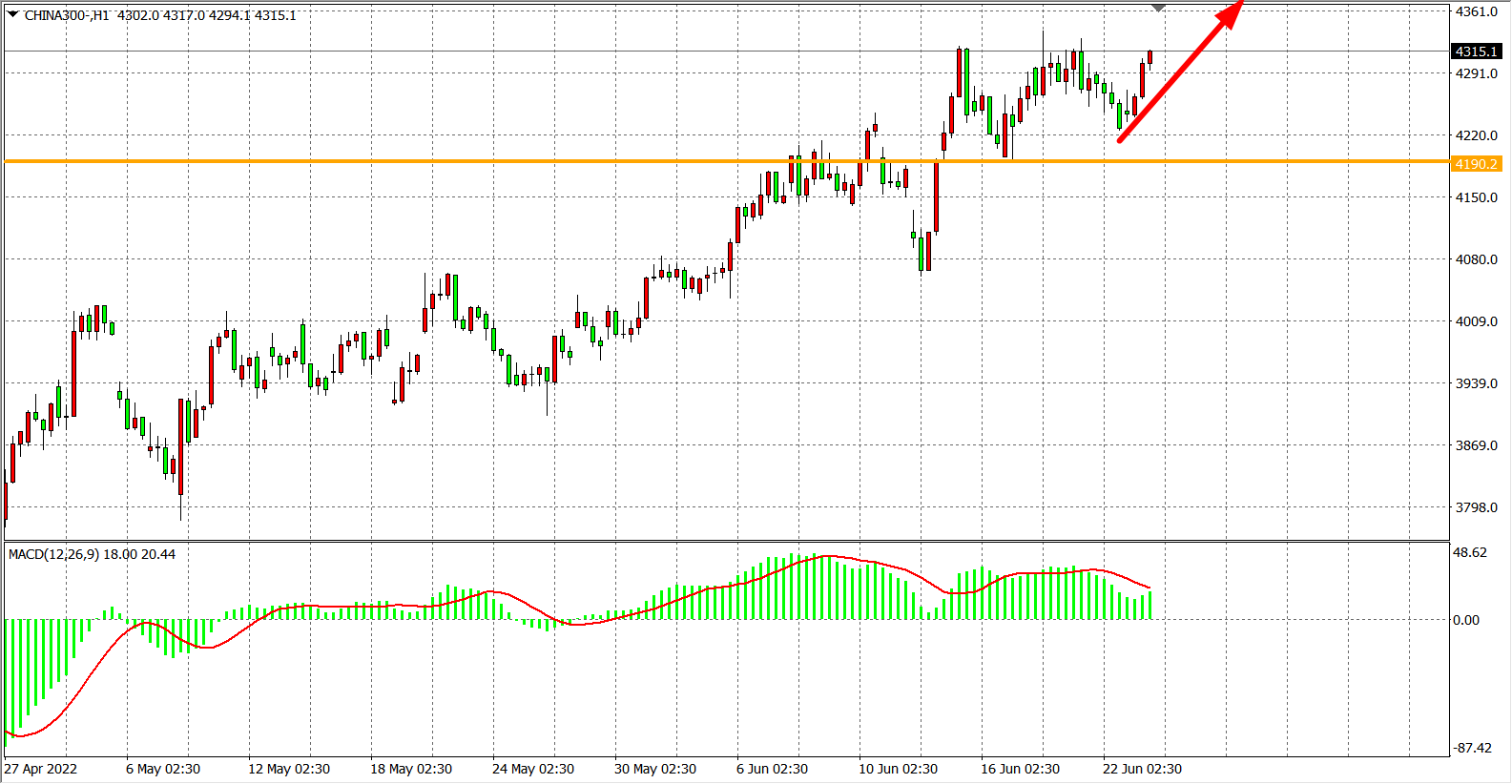 1小时图看,沪深300指数继续在4190之上运行,MACD在零轴之上开始放量,于是行情有进一步走高动能,维持在4190之上继续看震荡反弹,目标4450-4500,下破4190则下看4060附近