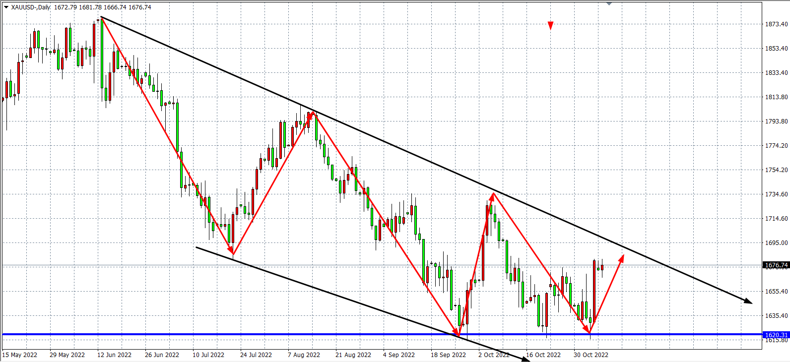 日线图显示,黄金持续企稳于1600-1620美元区域支持。该区域存在较强支撑,短期仍存进一步反弹动力,上方可重点关注1688-1700美元区域阻力。整体而言,尽管黄金已出现明显触底,但整体趋势仍未摆脱自2022年6月以来的下行趋势,因而投资者可重点关注1600美元附近支撑并耐心等待11月中旬后迎来的关键时间节点。