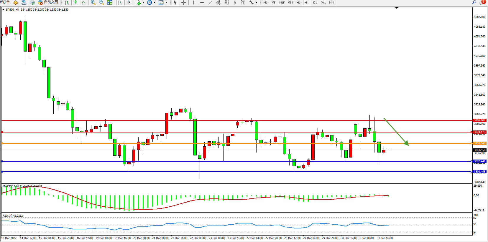 标普500指数1月3日(周二)收盘下跌15.75点,跌幅0.41%,报3823.75点;美国11月营建支出月率:这对第四季度的GDP来说是个好消息。在2023年,美国的基础设施支出法案将真正开始生效,这应该会推动政府方面的进一步措施,因为美国的房屋建设正急剧放缓。