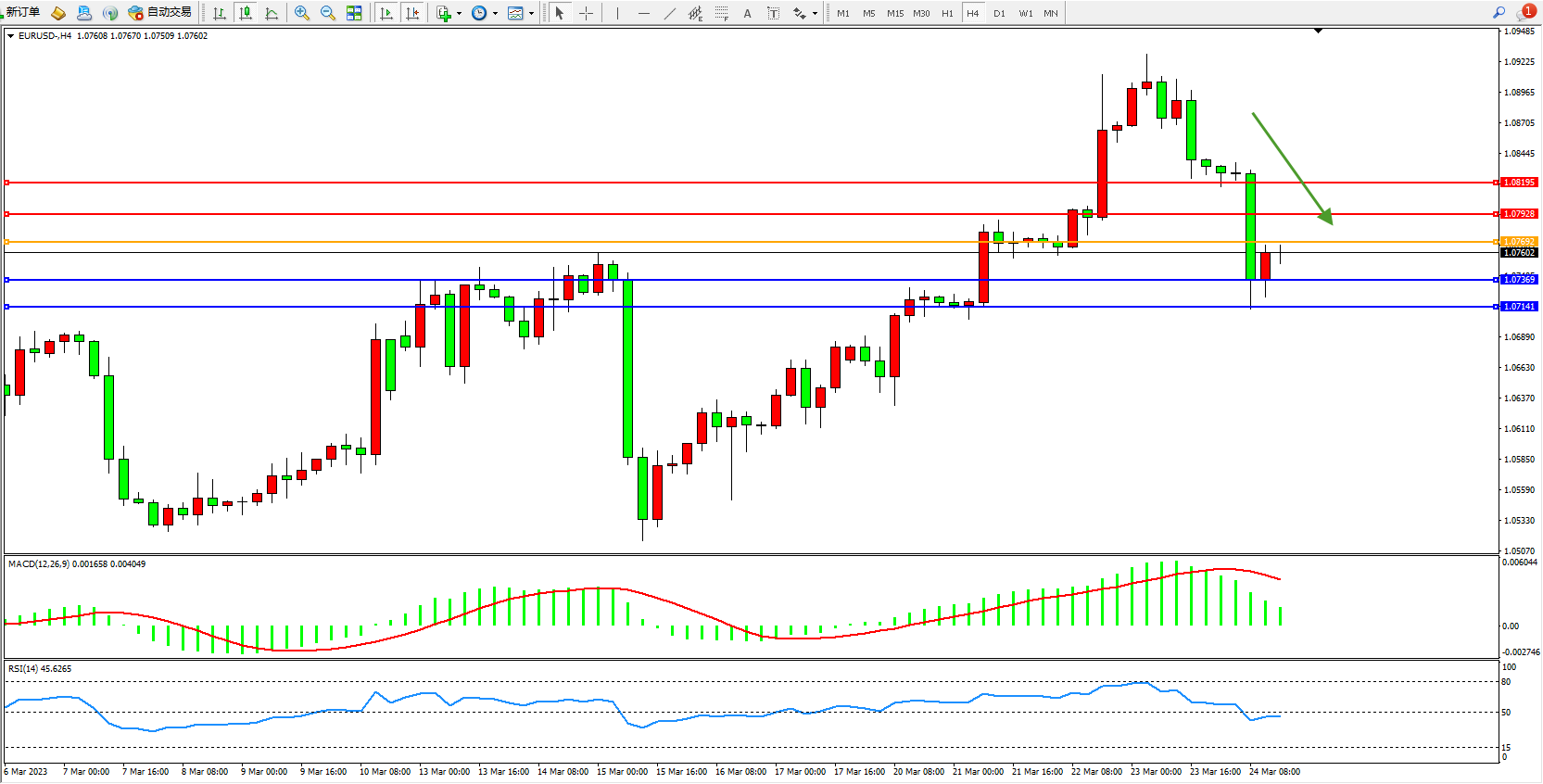 交易策略:1.07692下方看跌,目标1.07369  1.07141