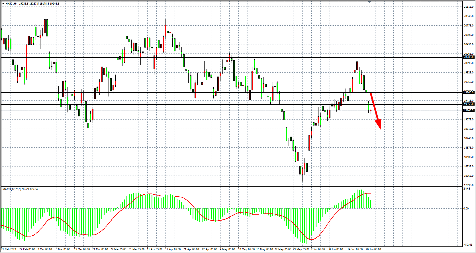 4小时图看,恒指进一步下破19350点,MACD量能在零轴上继续缩量,趋势转为空头,阻力关注19350-19560,下方目标看19000-18700。