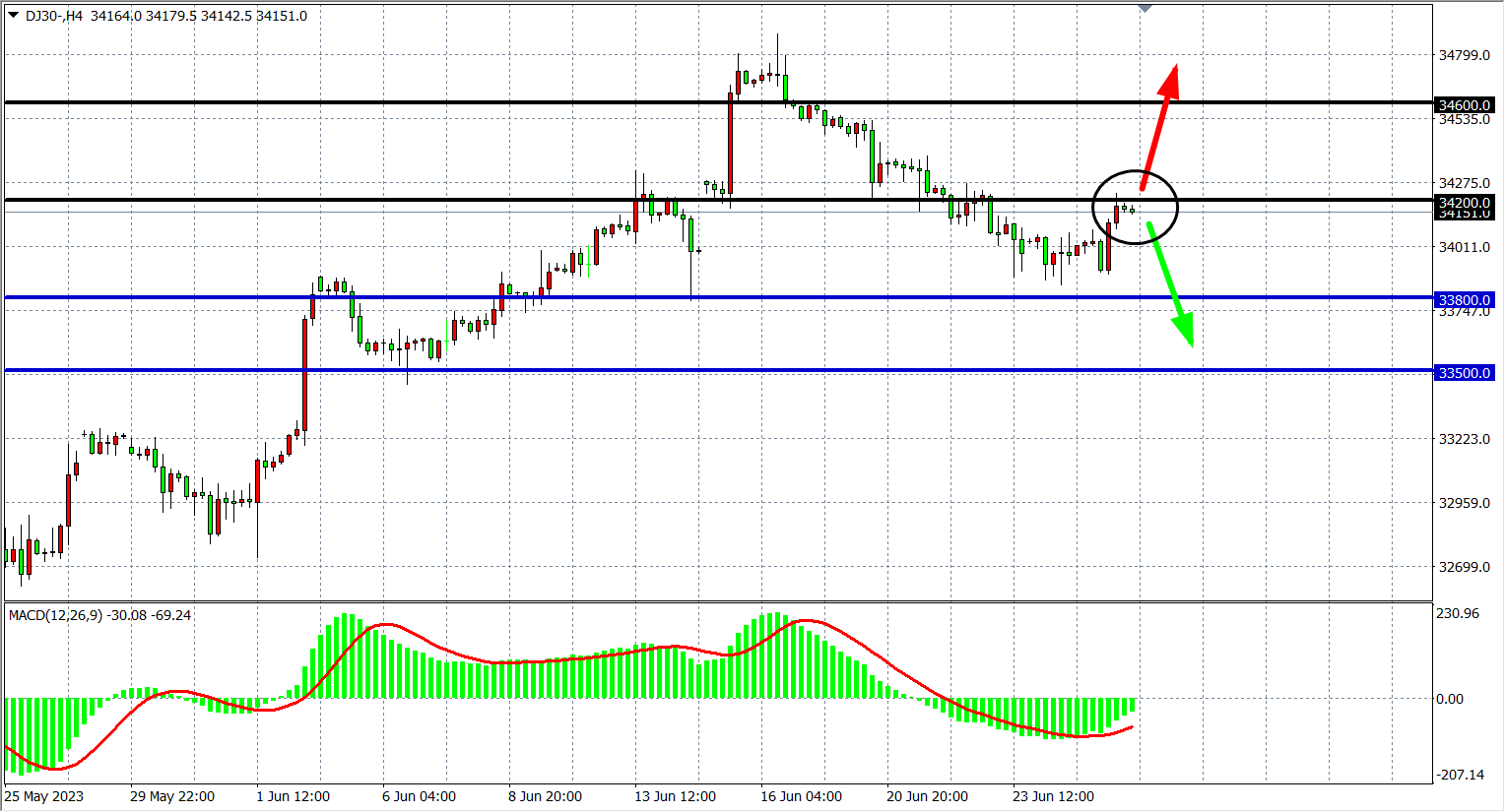 交易策略:34200 下方看跌,目标 33800 33500