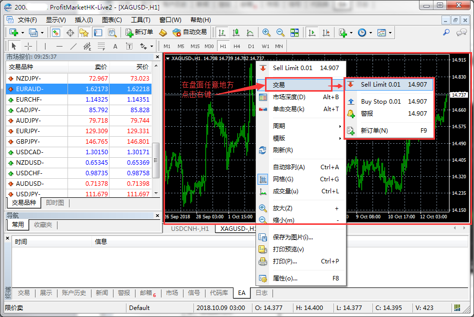 2.平仓:选定订单右击→【平仓】即可