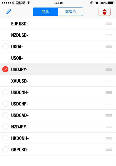●勾选商品后,点击右上角的删除按钮,删除商品。点击编辑按钮回到行情页面。