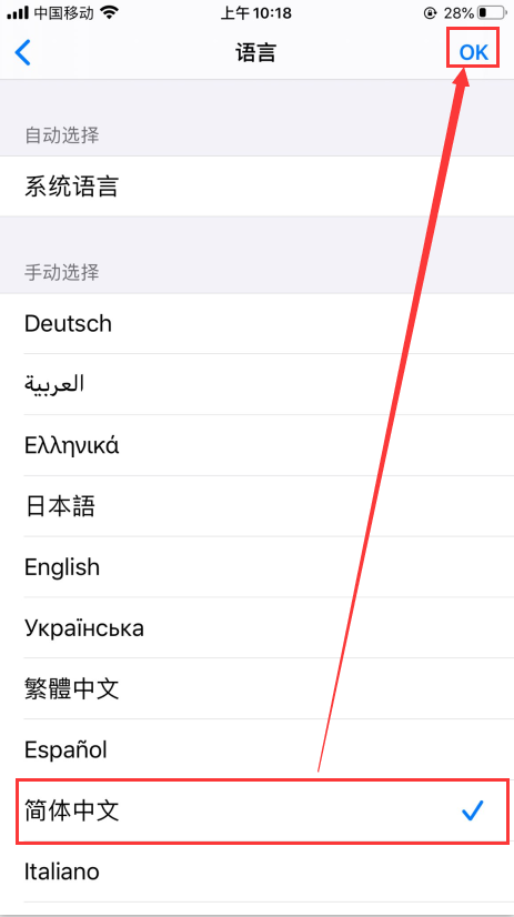 注:设置为简体中文后,点击右上角OK保存。
